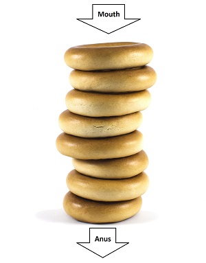Imagine your gut as a pile of bagels with your mouth as the hole at the top of the bagel pile. Food enters here and all that stands between it and contact with the inside of your body is a defensive line made up of a single layer of cells, represented here by the pile of bagels. Some foods can breach this line of defence and leak directly into your blood stream.